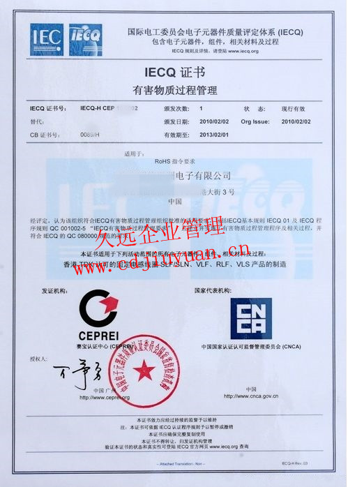 有害物質(zhì)過(guò)程管理體系認(rèn)證證書