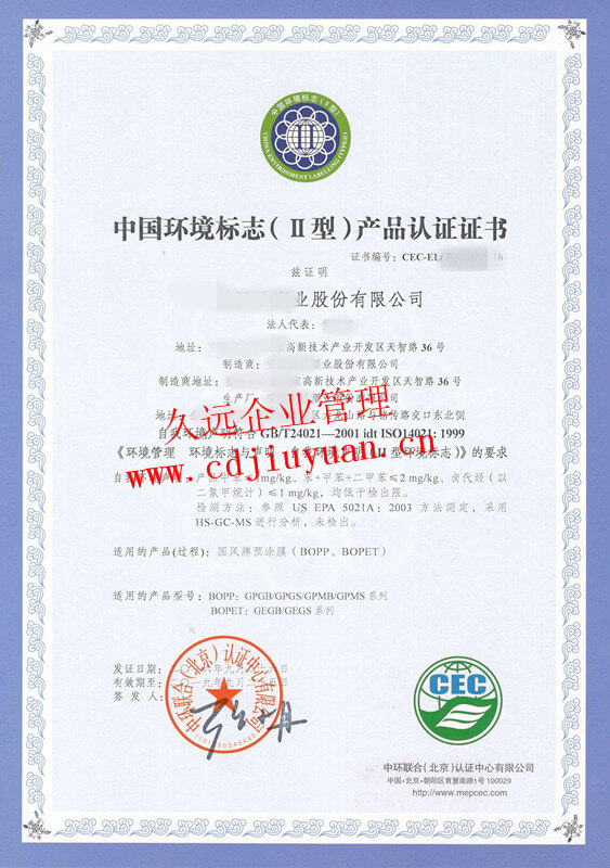 中國(guó)環(huán)境標(biāo)志產(chǎn)品II型認(rèn)證證書(十環(huán)II型)